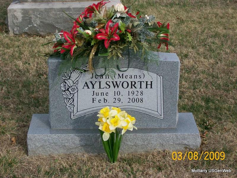| AYLSWORTH, Jean Marie (MEANS) | June 10, 1928 Pierce City, Lawrence Co., MO |