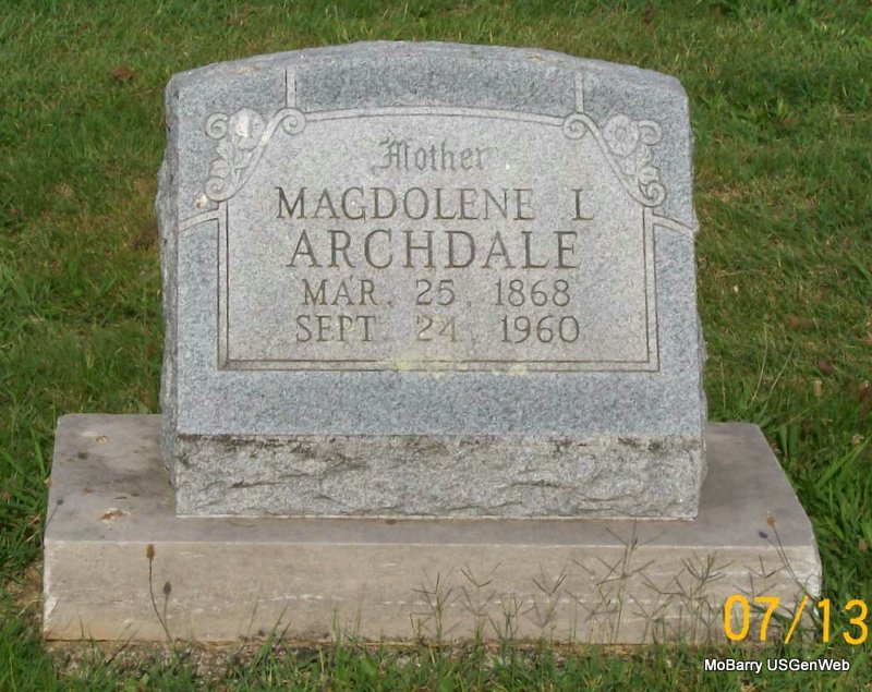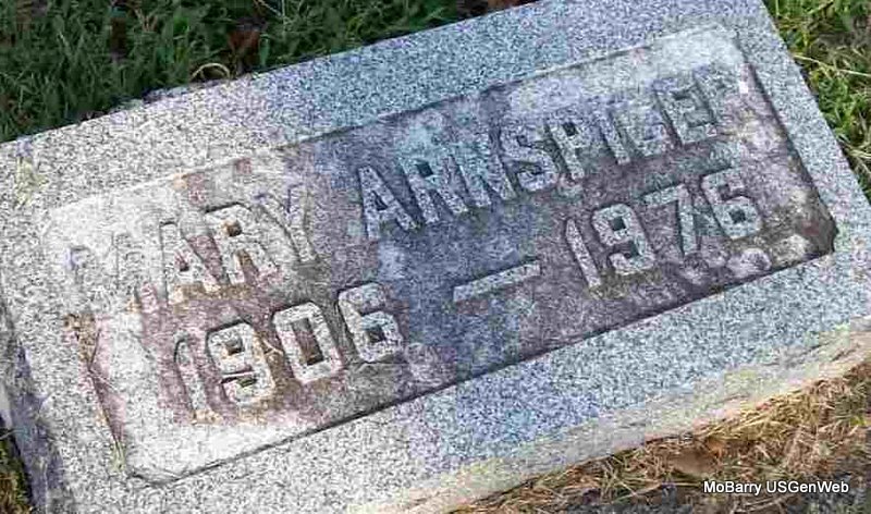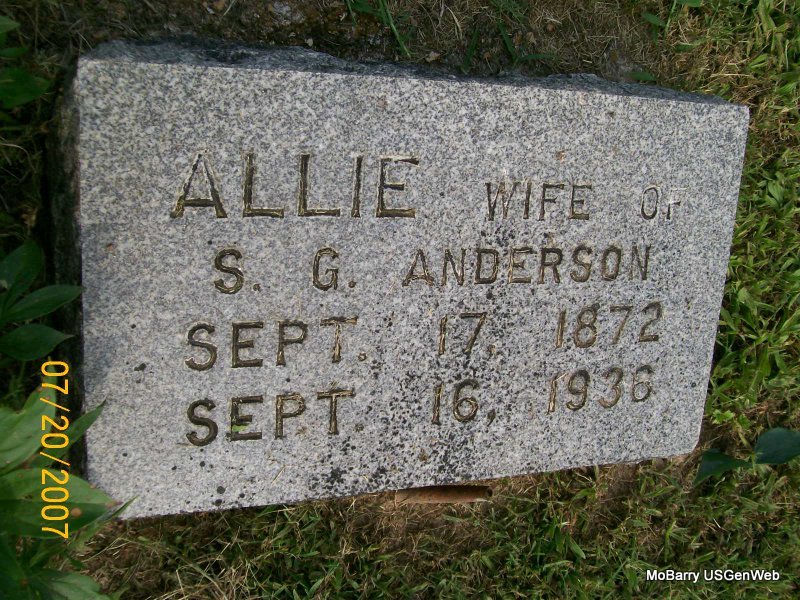Inscription: "Wife of S. G. Anderson" - Research Note: According to her death certificate her husband was named Sam Anderson. At the time of her death she was married, age 63 years, 11 months, and 19 days old. Her father was Grundy Burnett, born AR, and her mother was Mary Susan Bandy, born Beaver, AR. The cause of death was cerebral thrombosis, emphysema of gall bladder. Oliver Anderson, Monett, MO, was the informant. - Anderson Plot Stone | Death Certificate Donna Cooper Photo Jay Trace |