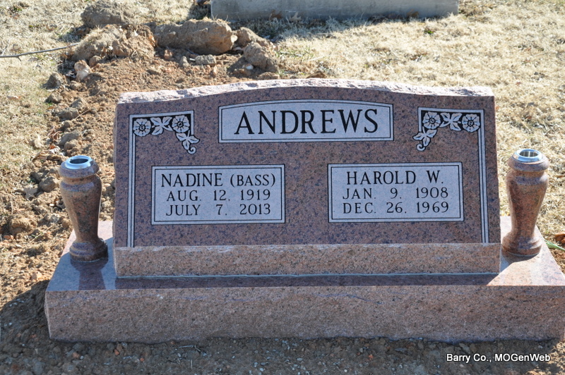 SSW: Nadine - Research Note: The cemetery log book for IOOF has this person listed as being buried in the old section in block 19, in lot 3, in grave 8, in the SE 1/4. His wife was Nadine Bass and she was the informant on the death certificate. Herb Bass purchased the lot. - Son of Andrew M. Andrews and Mary E. Ennis. Monett, MO resident. Apparent heart attack was the cause of death. He was hunting with a friend when attack occured and died on the way home. | IOOF Log Book Donna Cooper Death Certificate Phyllis Long Photo Jay Trace |