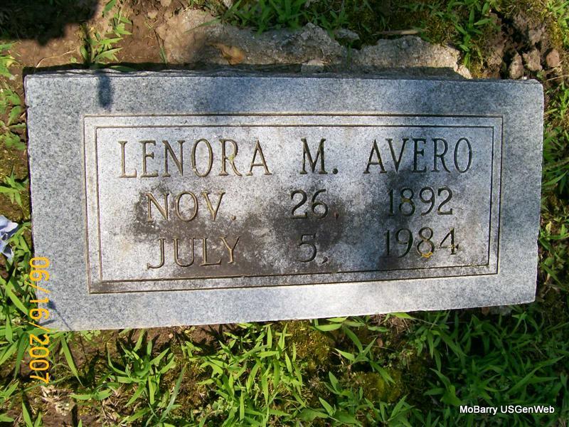 | AVERO, Lenora Maude | Nov. 26, 1892 | July 5, 1984 | Research Note: The cemetery log book has her middle name as Maude. In the 1940 Census, Jenkins, Barry Co., MO, she is head of household, divorced, age 48. She has a lodger, Melbourne L. Rounds, age 60, divorced, farm operator. He is buried next to Lenora Avero. | IOOF Log Book Census Phyllis Long Photo Jay Trace |