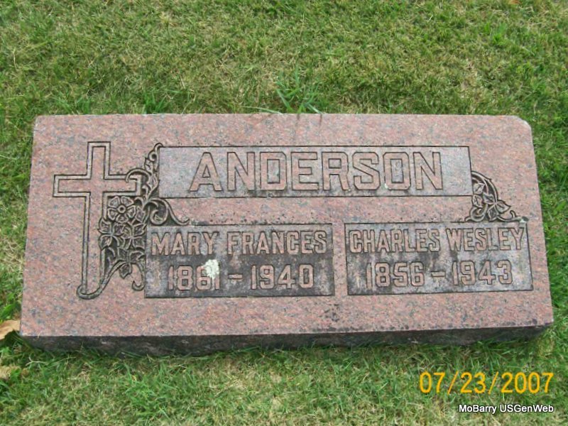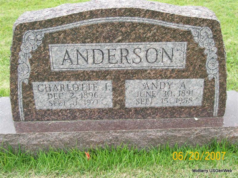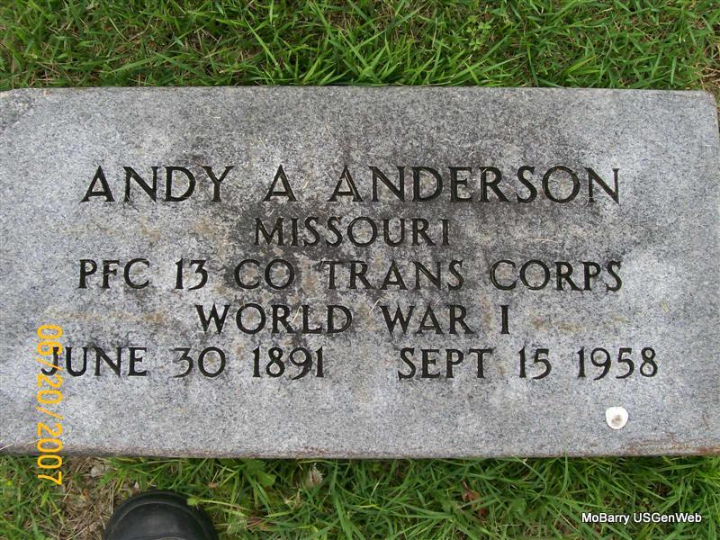 SSW: Charlotte I. - Research Note: He was the son of Charles W. Anderson and Frances Railsback. His wife was Charlotte and he was a railroad engineer. - Military Stone - Inscription: "MISSOURI PFC 13 CO TRANS CORPS WORLD WAR I" | Death Certificate Phyllis Long Photo Jay Trace |