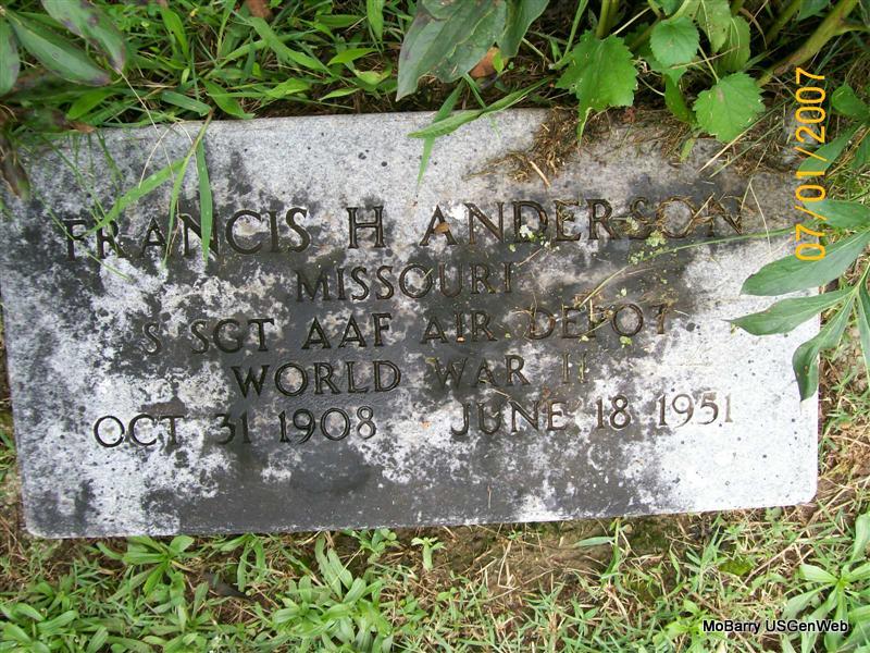 Inscription: "MISSOURI SGT AAF AIR DEPOT WORLD WAR II" - Research Note: The cause of his death was from electrical shock and burns; electrocution and fall from pole. Both of his parents names were not listed. Informant: Amos Horner, Cassville, MO - Death Certificate Number: 29395 - Diana's Note: He was divorced. The accident occurred on a farm in Roaring River Twp., Barry Co., MO. Injury occurred when he touched a high line (7200 volts) while repairing a fuse. - Son of David Ebenezer Anderson and Lillie Ellen Patterson. At age 35, Francis married Margaret Toppin, age 30, on Nov. 24, 1043 in Hot Springs, Garland Co., AR. | Death Certificate Diana (Anderson) Cope Census AR Marriage Index Phyllis Long Photo Jay Trace |