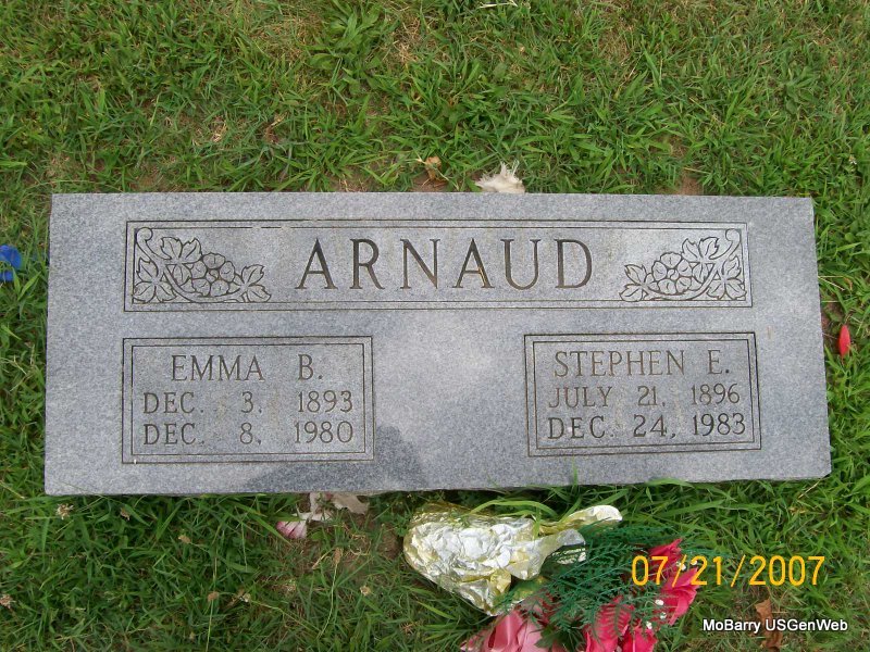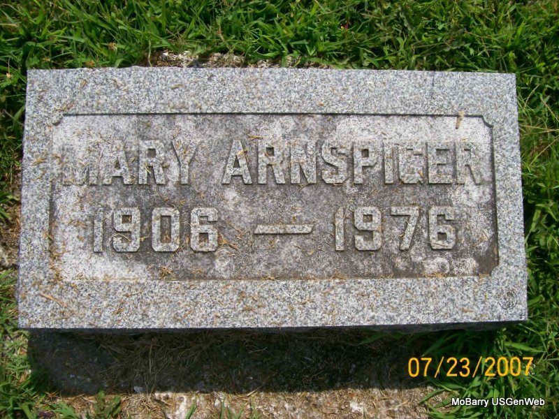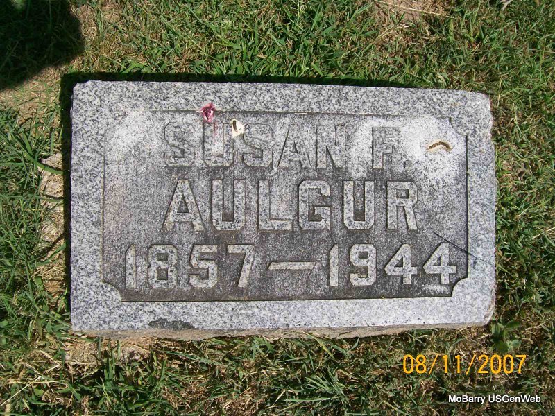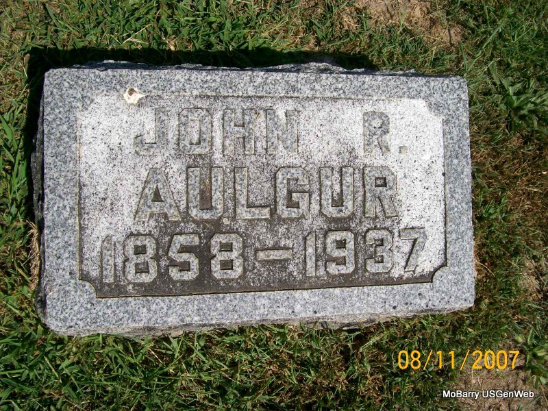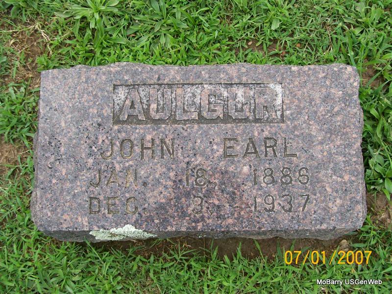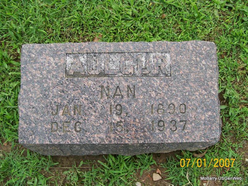 Research Note: Her death certificate names John R. Aulgur as her husband. Her father was given as Nathan Curry, born TN and her mother as Basheba Patterson, born TN. She is listed as a widow 2 times. Cause of death was given as myocardial degeneration and chronic Myocardial. Her usual address was 610 Benton Ave., Monett, Barry Co., MO, and she had lived in the community 43 years. - Aulgur Plot Stone |