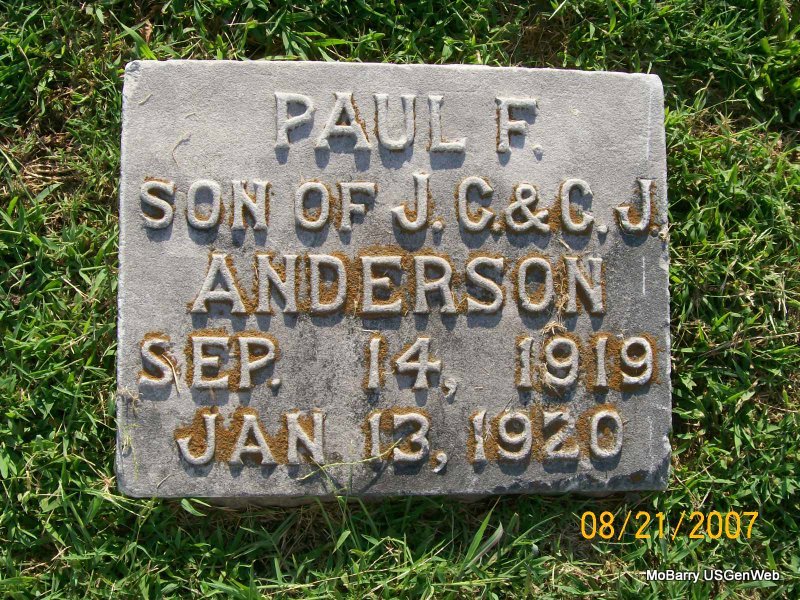 Inscription: "Son of J. C. and C. J." - Research Note: He is buried in the Gillette section and next to James Wesley Anderson. His death certificate reads that his father was given as John Cook Anderson, born MO and his mother as Callie Vinita Parker, born Granby, MO. The cause of death was double lobar pneumonia and croup. Jo Anderson, Monett, MO, was the informant. The stone has J. C. and C. J. as the parents, but the mother's name was given as Callie Vinita on the death certificate. The cemetery stone for John and Callie has her middle initial as J. Her name was Callie Juanita. | Death Certificate Donna Cooper Photo Jay Trace |
