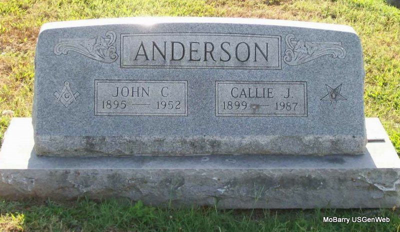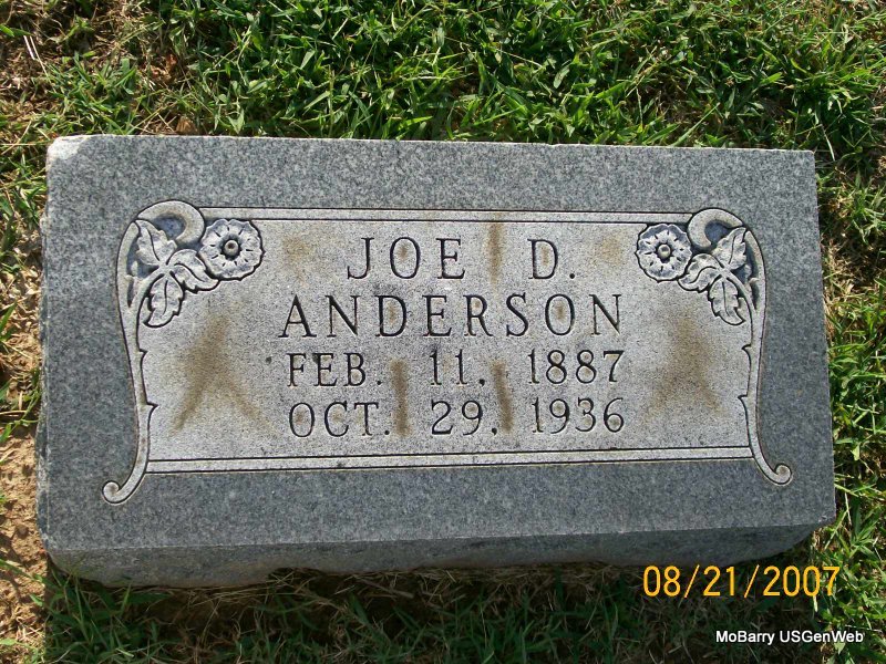 | ANDERSON, "Joe" Joseph Daniel | Feb. 11, 1887 | Oct. 29, 1936 | Research Note: He is buried next to his brother John Cook and Callie (Parker) Anderson. Son of Charles W. Anderson and his mother as Mary Frances Railsback. | Note Donna Cooper Census Phyllis Long Photo Jay Trace |