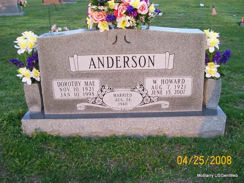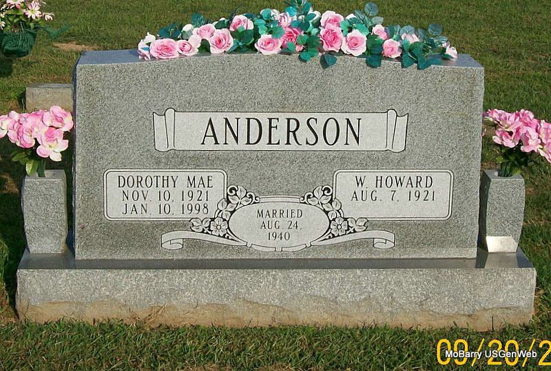 SSW: Dorothy Mae - Inscription: "Married Aug. 7, 1921" - Research Note: Howard Anderson, age 85, of Monett, died June 15, 2007, at his home. He was born August 7, 1921, in Monett, MO and was a son of Oliver and Orba (Howard) Anderson. He married Dorothy Mae Medlin on August 24, 1940, in Cassville, MO, and she preceded him in death. - He is listed as Howard Anderson in the log book. - Military Stone - Inscription: "PVT US ARMY WORLD WAR II" - Another Photo - Another Photo of Military Stone | Monett Times, June 17, 2007 Donna Cooper Photos Jay Trace |