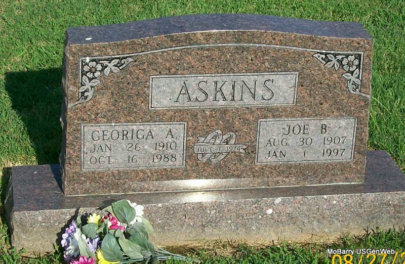 | ASKINS, Joe B. | Aug. 30, 1907 | Jan. 1, 1997 | SSW: Georgia A. - Inscription: "June 1, 1974" - Research Note: Son of Ira D. Askins and Ollie May Hillhouse. Still single and living with his mother in the 1940 census. | Census Phyllis Long Photo Jay Trace |