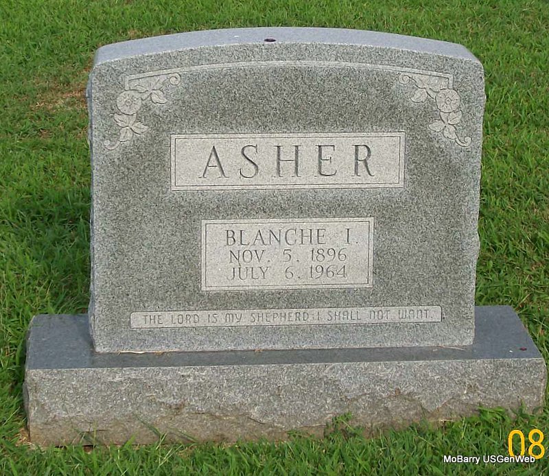 | ASHER, Blanche I. | Nov. 5, 1896 | July 6, 1964 | Inscription: "The Lord Is My Shepherd I Shall Not Want" | Photo Jay Trace |