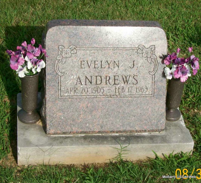 | ANDREWS, Harold W. | No Date | Feb. 1963 | Research Note: the City of Monett has this person listed as being buried in the 2nd section, block 3, lot 1, grave 8, in the SE 1/4. The listed that he was buried Feb. 18, 1963. H. W. Andrews owned the lot and Mercer Funeral Home took care of the arrangements. Buried next to Evelyn Julia Andrews. Died the same time as Evelyn. No birth or death date given on the log book. No death certificate found. NO STONE | IOOF Log Book Donna Cooper Note Phyllis Long |