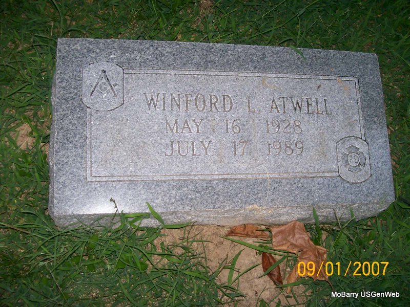 | ATWELL, Winford Louis | May 16, 1928 | July 17, 1989 | Research Note: Buried in 2nd Section, Block 15, Lot 3, Grave 3. Lot Owner, Ella Atwell - Lakin Funeral Home, Pierce City, MO. He was a Veteran. He was the son of Clausie Laurels and Ella Etta (Powell) Atwell. He first married Rayanne Guinney. His second wife was Dorothy Ann (Sullens) (Mercer) Atwell. | IOOF Log Book Dorothy's Obit Phyllis Long Photo Jay Trace |