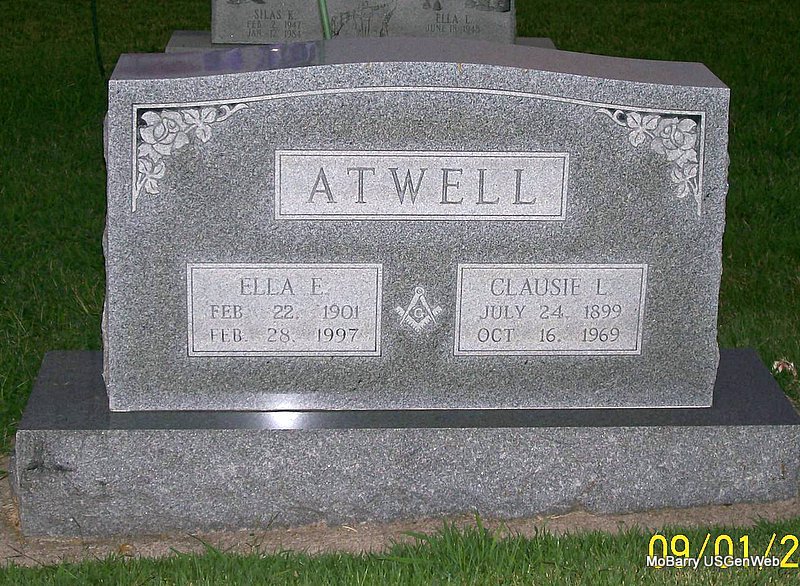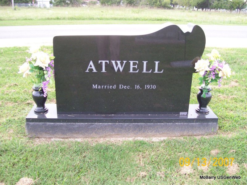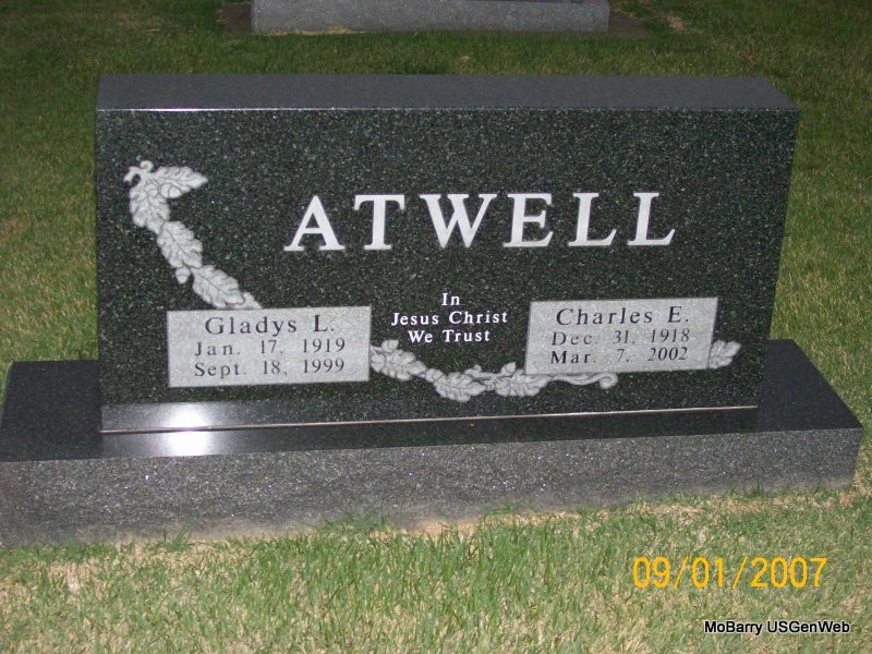 SSW: Gladys - Research Note: The cemetery log book has listed that he was a veteran. According to his obituary, Charles L. Atwell, age 83, of Monett, died March 7, at St. John's Regional Health Center in Springfield. He was a son of Amos H. and Armanda C. (Kinsley) Atwell and was a switchman for Frisco Railroad. He was a member of Liberty Methodist Church in Monett and the Railroad Retirement Club. He married Gladys L. McCormack on November 12, 1937, in Monett, and she preceded him in death September 18, 1999. Services were March 9, at Liberty Methodist Church in Monett. Burial was in Monett IOOF Cemetery under the direction of Buchanan Funeral Home of Monett. Source: Monett Times - Stone has Charles E. and paper has Charles L. as his name. | IOOF Log Book Note Phyllis Long Obit Donna Cooper Photo Jay Trace |