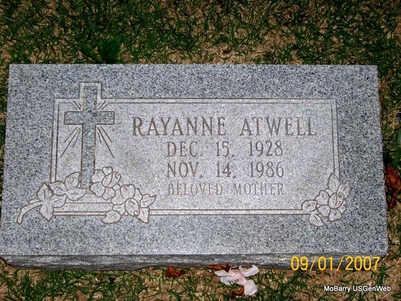 | ATWELL, Rayanne (GUINNEY) | Dec. 15, 1928 | Nov. 14, 1986 | Inscription: "Beloved Mother" - Research Note: Winford L. Atwell, age 19, married Rayanne Guinney, age 19, on Apr. 30, 1948 in Monett, Lawrence Co., MO. Winford's mother, Ella E. Atwell, gave consent. Daughter of Ray Albert and Flora Anne Guinney. | MO Marriage Records Census Phyllis Long Photo Jay Trace |