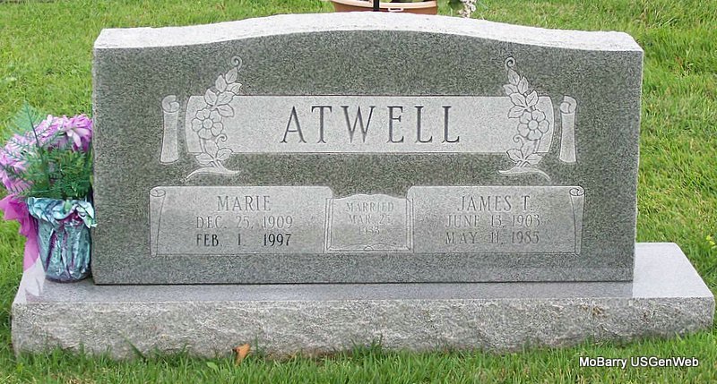 | ATWELL, James Tennyson | June 13, 1903 | May 11, 1985 | SSW: Marie - Inscription: "Married Mar. 21, 1953" - Research Note: The cemetery log book has listed that he was a veteran. Son of Henry Amos Atwell and Arminda Catherine Kinsley. J. T. Atwell, age 26, married Fay Essman, age 18, on Apr. 10, 1928 in Crawford Co., AR. He second married Marie Massey. | IOOF Log Book AR Marriage Index Phyllis Long Photo Jay Trace |