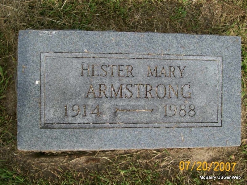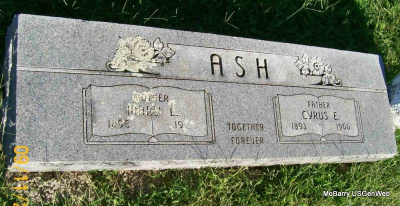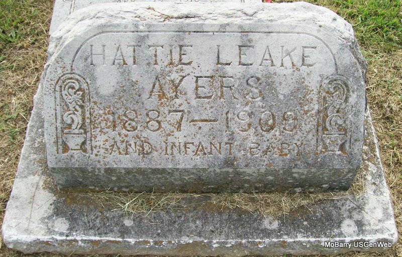 Inscription: "And Infant Baby" - Research Note: The Callaway Funeral Home Records state that the cause of her death was TB and that she died on the 28th of July in 1909. They have that J. E. (probably I. E.) Ayers owned the lot. She was age 22 years and 10 months old and was married. Hattie Leake, age 21, married Isaac E. Ayers, age 24, on Nov. 28, 1907 in Monett, Barry Co., MO. Daughter of James Cyrus Leake and Mary C. Miller, both buried at I.O.O.F. Cemetery. | Callaway Funeral Home Donna Cooper MO Marriage Records Census Phyllis Long Photo Jay Trace |