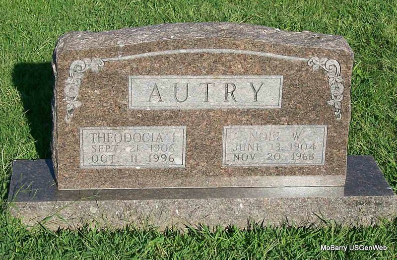 | AUTRY, Theodocia Irene (CORNETT) | Sept. 21, 1906 | Oct. 11, 1996 | SSW: Noel W. - Research Note: The cemetery log book has that the Funeral Home was Penwell-Gable, Topeka, KS. Noel W. Autry age 29 from Pierce City, MO, married Theodocia Irene Cornett, age 26 from Fairplay, MO, on July 28, 1933 in Fairplay, Polk Co., MO. Daughter of James Thomas Cornett and Minnie June Cunningham. | IOOF Log Book MO Marriage Records Census Phyllis Long Photo Jay Trace |