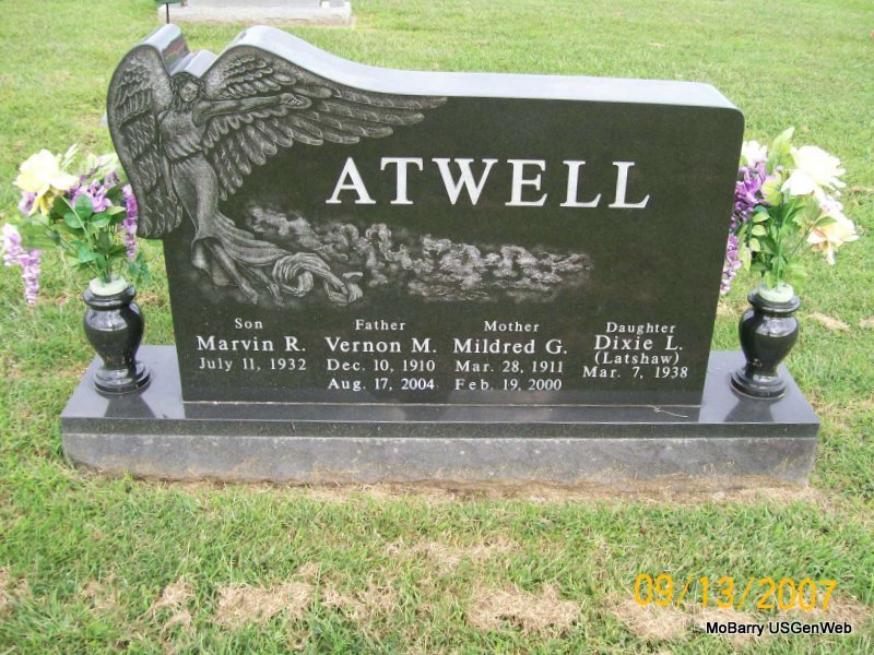 SSW: Marvin R., Mildred G. and Dixie L. Latshaw - Back of Stone Inscription: "Married Dec. 16, 1930" - Research Note: Marvin and Dixie are their children. Vernon M. Atwell, age 93, of Monett, died August 17, 2004, at Monett Health Care Center. Mr. Atwell was born December 10, 1910, in Richwoods Township, the son of Amos Henry and Armindy (Kinsley) Atwell. He was a member of the Railroad Retirement Club, Transportation International Union, Monett Senior Citizens, and First Baptist Church in Monett. He married Mildred Franklin on Dec. 16, 1930, in Aurora, and she preceded him in death Feb. 19, 2000. He was preceded in death by six brothers and six sisters. - Back of Stone | Aug. 18, 2004, Monett Times Donna Cooper Photo Jay Trace |