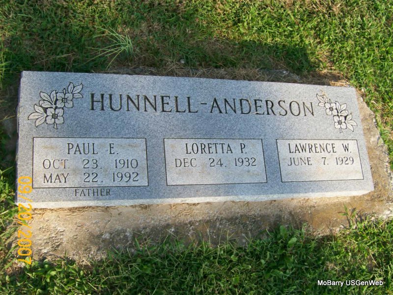 | ANDERSON, Loretta Pauline (HUNNELL) | Dec. 24, 1932 | No Date | SSW: Lawrence W. and Paul E. - Research Note: Her husband was Lawrence W. Anderson. Daughter of Paul E. Hunnell and May Steele. | Census Phyllis Long Photo Jay Trace |