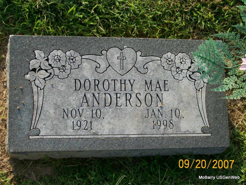 | ANDERSON, Dorothy Mae (MEDLIN) | Nov. 10, 1921 | Jan. 10, 1998 | SSW: W. Howard - Inscription: "Married Aug. 24, 1940" - Research Note: Daughter of Dellmar Weneford Medlin and Mable Combe. - Another Photo - Another Stone | Census Phyllis Long Photos Jay Trace |