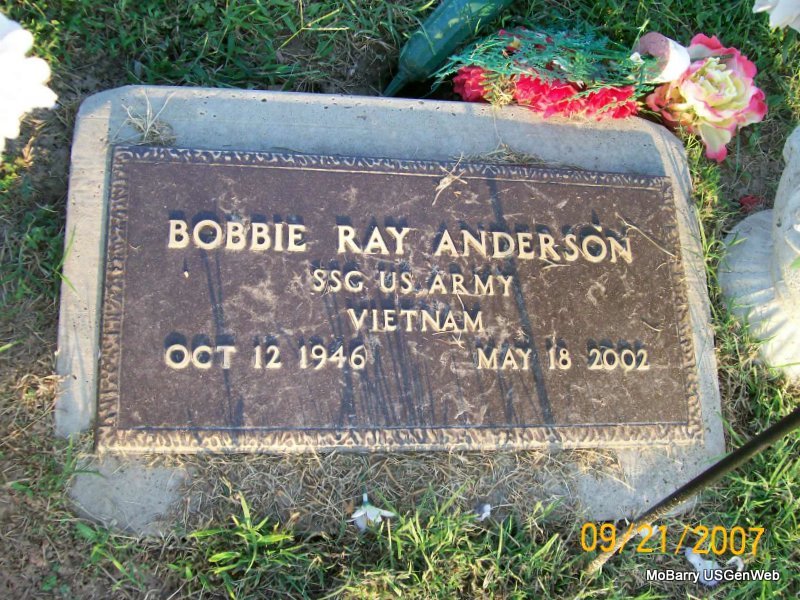 Inscription: "SSG US ARMY VIETNAM" - Research Note: Son of Charles H. and Betty Jean (Johnson) Anderson, married Marcella Maples on June 4, 1966, in Springfield. Donna's Note: Bobbie Ray Anderson, age 55, of Aurora, died May 18, 2002 at the U of A Medical Center in Little Rock, AR, following a long illness. He was born Oct. 12, 1946, in Preston, MO, the son of Charles H. and Betty Jean (Johnson) Anderson. He was a retired chef and had worked at several restaurants. He was retired a master chef from the U. S. Army. He married Marcella Maples on June 4, 1966, in Springfield. He was preceded in death by one brother, David Anderson; and one sister, Pamela Sue. | Monett Times May 20, 2002 Mary Homesley Note Donna Cooper Photo Jay Trace |