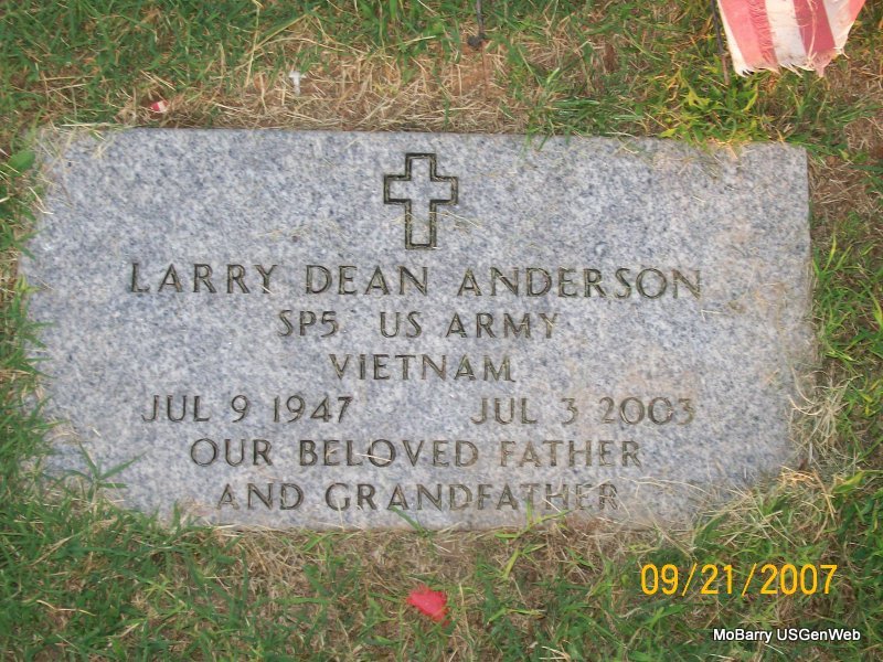 Inscription: "SP 5 US ARMY VIETNAM - OUR BELOVED FATHER AND GRANDFATHER" - Research Note: Larry Dean Anderson, age 55, of Monett, died July 3rd, 2003, at his home. He was born July 9, 1947, in Aurora, MO, and was a son of Charles E. and Verla M. (Pringle) Anderson. Monett Times - Another Stone | Obit Donna Cooper Photos Jay Trace |