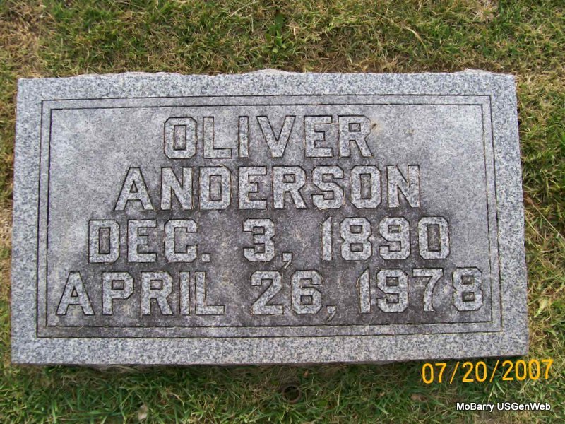 | ANDERSON, Oliver Sampson | Dec. 3, 1890 | Apr. 26, 1978 | Research Note: He was a son of Sampson George and Allie (Burnett) Anderson and he is buried beside them. - Anderson Plot Stone | Note Donna Cooper Photo Jay Trace |