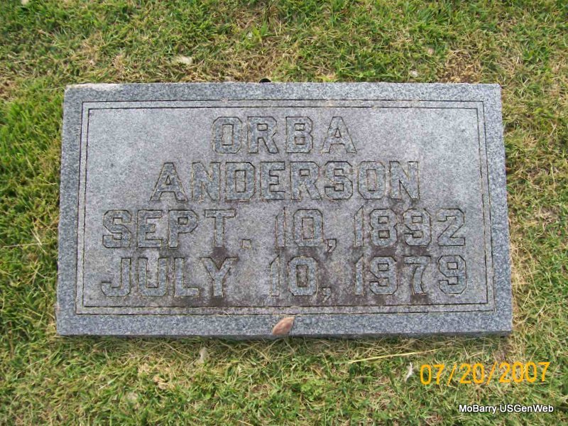 | ANDERSON, Orba Marie (HOWARD) | Sept. 10, 1892 | July 10, 1979 | Research Note: She was the wife of Oliver Anderson and is buried beside him in the Anderson plot. Orba Howard, age 18, married Oliver Anderson, age 21, on Dec. 18, 1912 in Monett, Barry Co., MO. Daughter of Francis Marion Howard and Ellen Elizabeth Davis. - Anderson Plot Stone | Note Donna Cooper MO Marriage Records Census Phyllis Long Photo Jay Trace |
