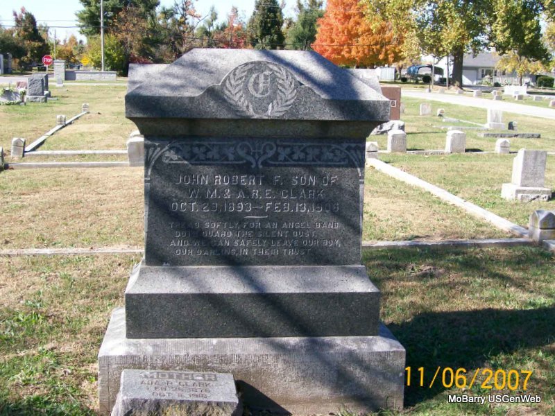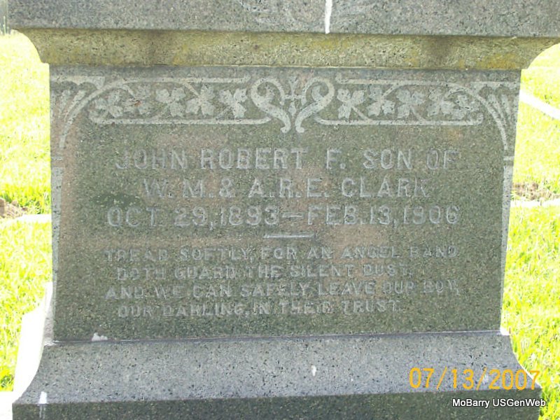 | CLARK, John Robert F. | Oct. 29, 1893 | Feb. 13, 1906 | Inscription: "Son of W. M. and A. R. E. Clark" - Another Photo | Photos Jay Trace |