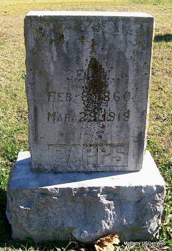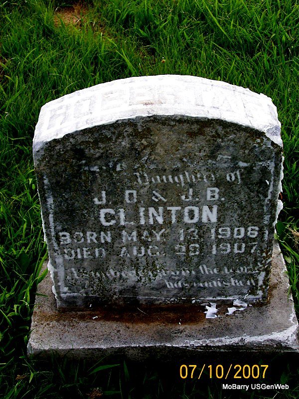 Inscription: "Son of J. T. and M. J. CLINTON" - Research Note: Died after being crushed between two train cars. Son of James Thomas Clinton and Martha J. Matlock. - Another Photo | Headstone Jeri Waters Census Phyllis Long Photos Connie Schmidt |