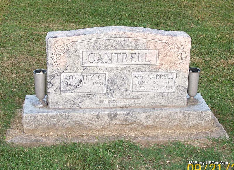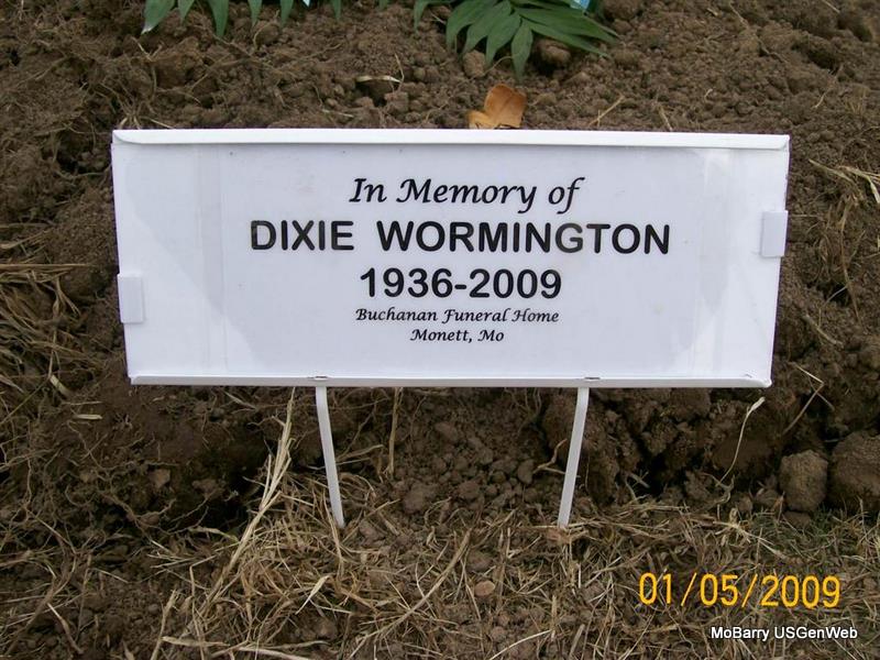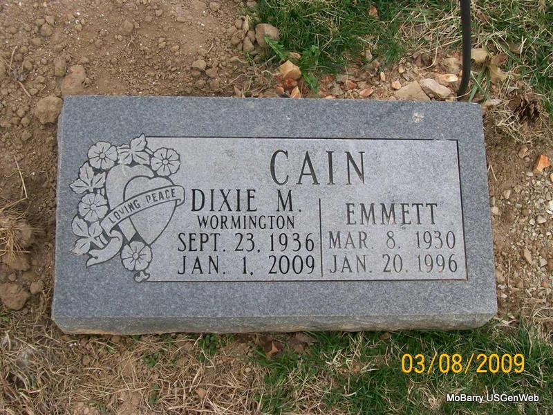 SSW: Emmett - Research Note: Temporary Marker. Also listed under Cain. She was a daughter of Frank and Golda (Carr) Ritter. Donna's Note: Dixie Wormington, age 72, of Monett, died yesterday, January 1, 2009. She was born October 8, 1936 (stone has Sept. 23, 1936), in Lincoln, MO, and was a daughter of Frank and Golda (Carr) Ritter. Emmett Everett Cain, age 39, married Dixie Merle Hoit, age 33, on Dec. 1, 1969 in Rolla, Phelps Co., MO. She married Glen Wormington on April 3, 1997, in Eureka Springs, Arkansas. She is buried next to and has a double stone with Emmett Cain. - Another Photo | AR Marriage Index MO Marriage Records Phyllis Long Photos Monett Times Jan. 2, 2009 Jay Trace |