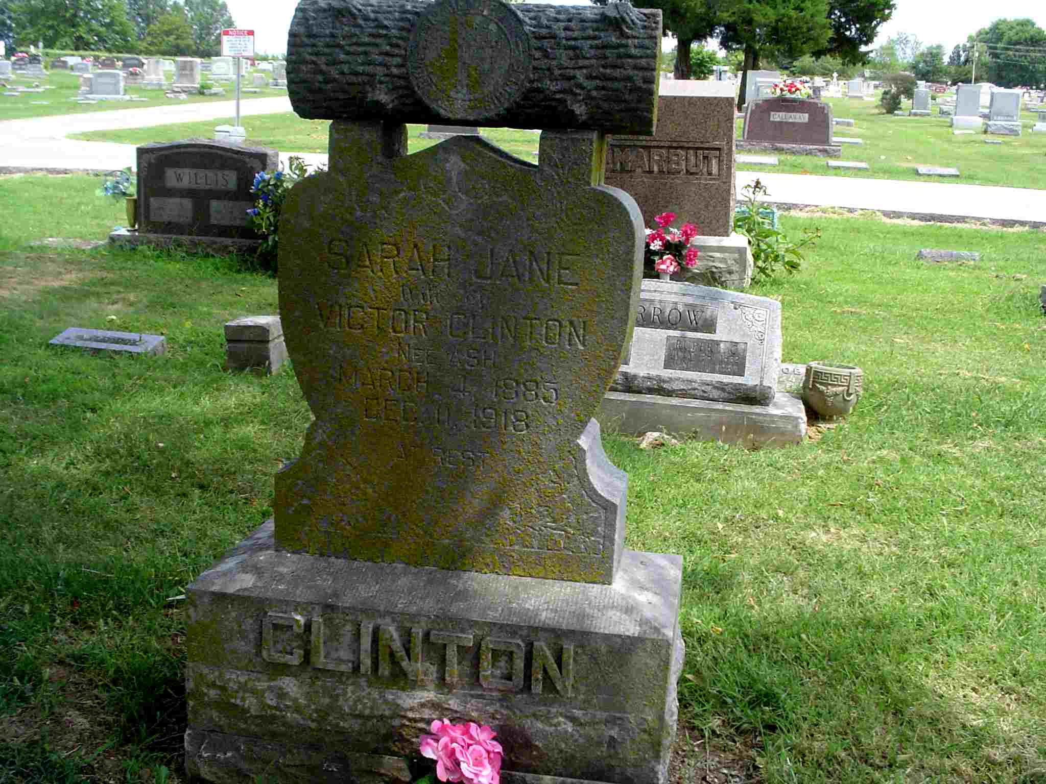 Inscription: "Wife of Victor Clinton - Nee Ash" - Research Note: Her death certificate states that her father was Ellwood Ash, born in PA and Hannah Batkins born in IL. She died from the effects of the Spanish Flu. - Another Photo | Photo Death Certificate Donna Cooper Photo Jay Trace |