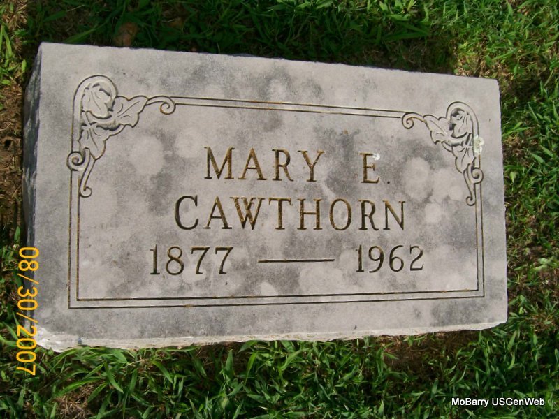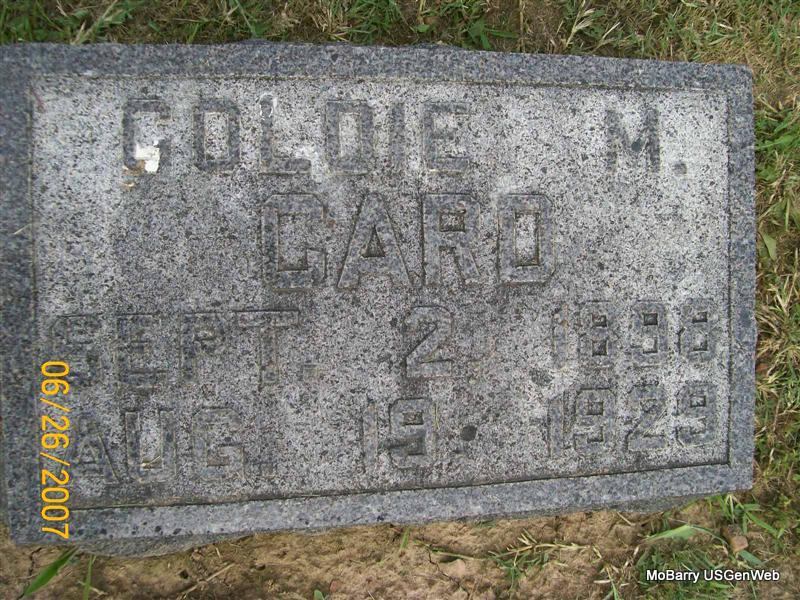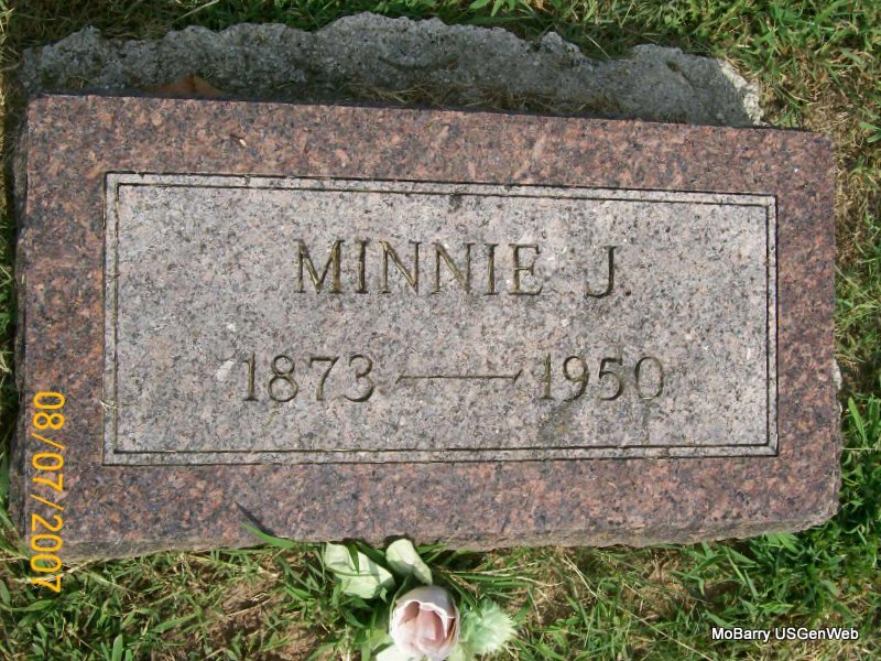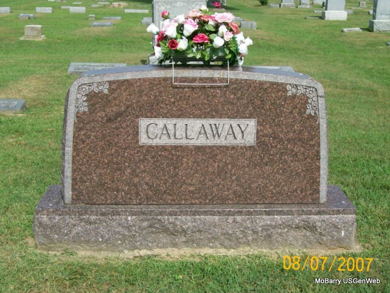 Research Note: Her death certificate has her birth year as 1872 and not 1873 as the stone reads. Her father was given as Samuel J. Redwine and her mother as Keziah Hancock. Robert M. Callaway, deceased, was given as her husband. Mrs. Earl B. Hobbs of Kansas City, MO, gave the information. - Minnie Redwine married Robert M. Callaway on Jan. 7, 1891 in Barry Co., MO. - Callaway Plot Stone - Another Photo | Photos Death Certificate Donna Cooper MO Marriage Records Phyllis Long Photos Jay Trace |