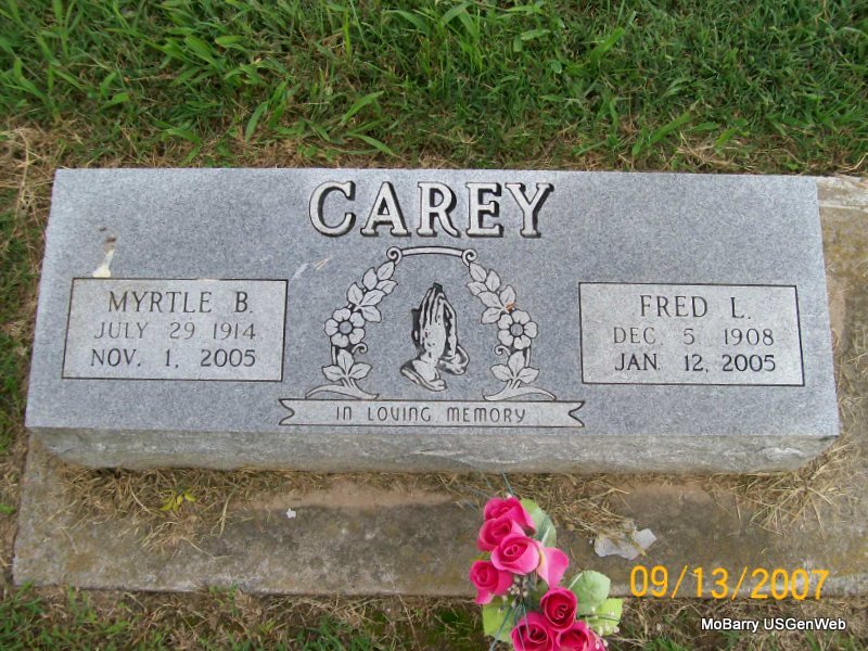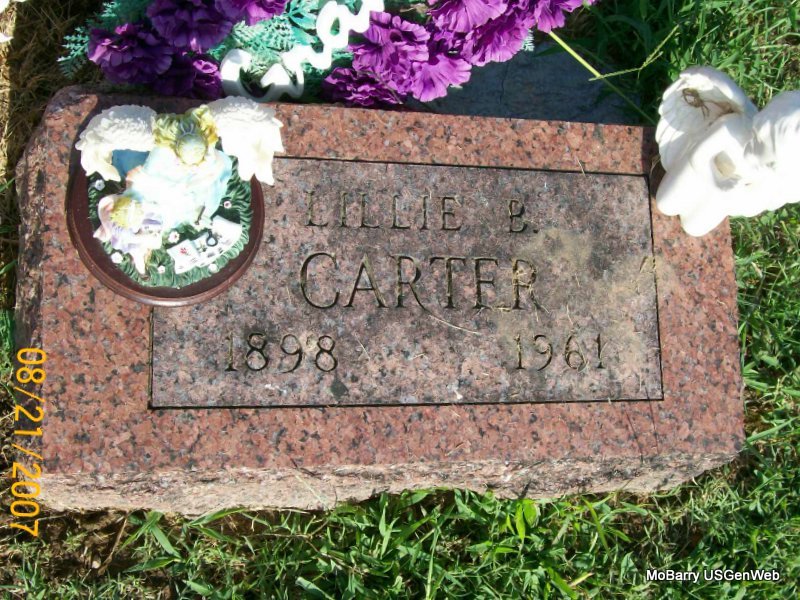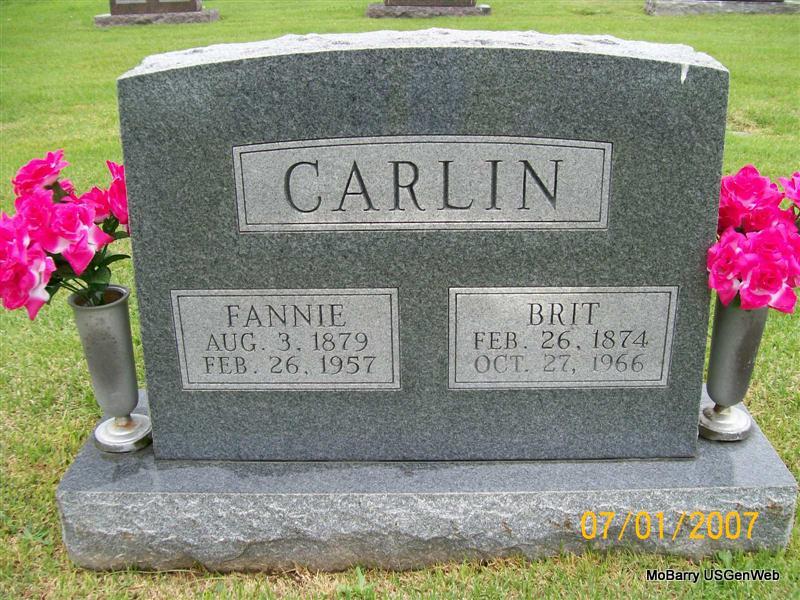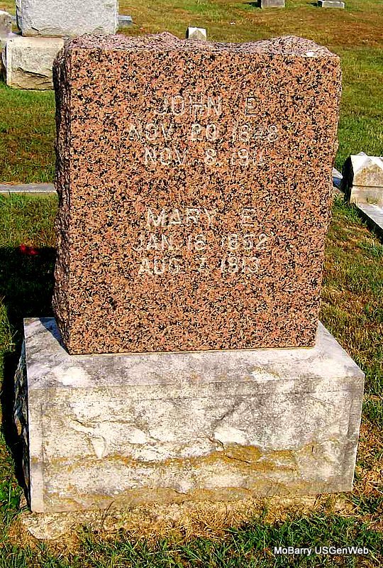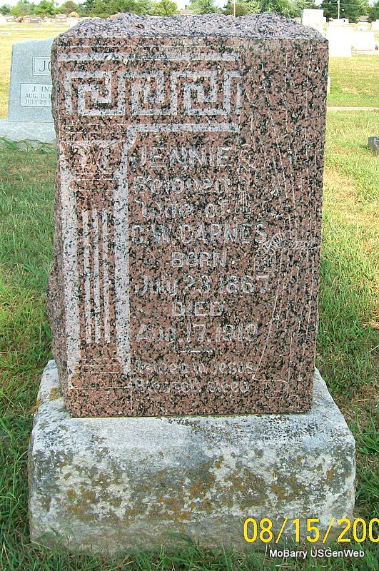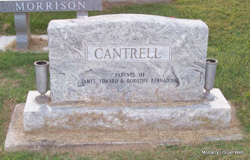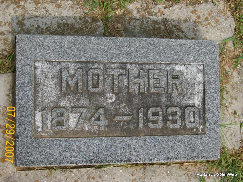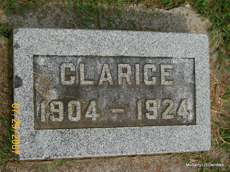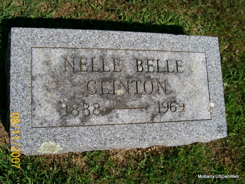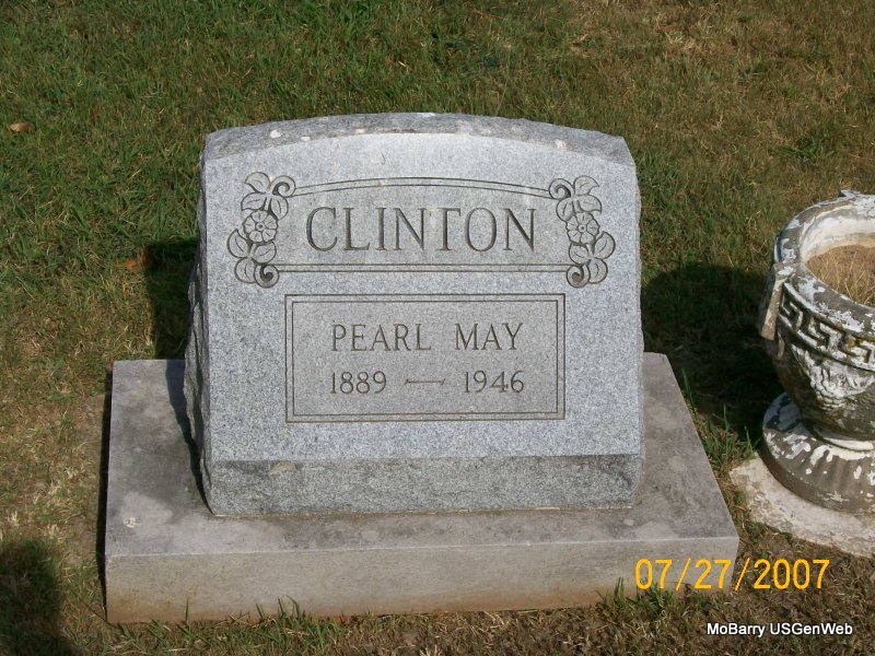 Research Note: According to her death certificate John Thomas Clinton, age 61 was her husband. Her usual address was 504 4th St., Monett, Barry Co., MO, and she had lived in the community for over 50 years. She was age 57 years, 6 months and 21 days old at the time of her death. The cause of death was bronchi pneumonia, hemiplegic. Her father was Charles C. Miller, born NE and her mother Clara Etta Propst. J. T. Clinton, 504 4th St., Monett, MO, was the informant. - Another Stone | Death Certificate Donna Cooper Photos Jay Trace |