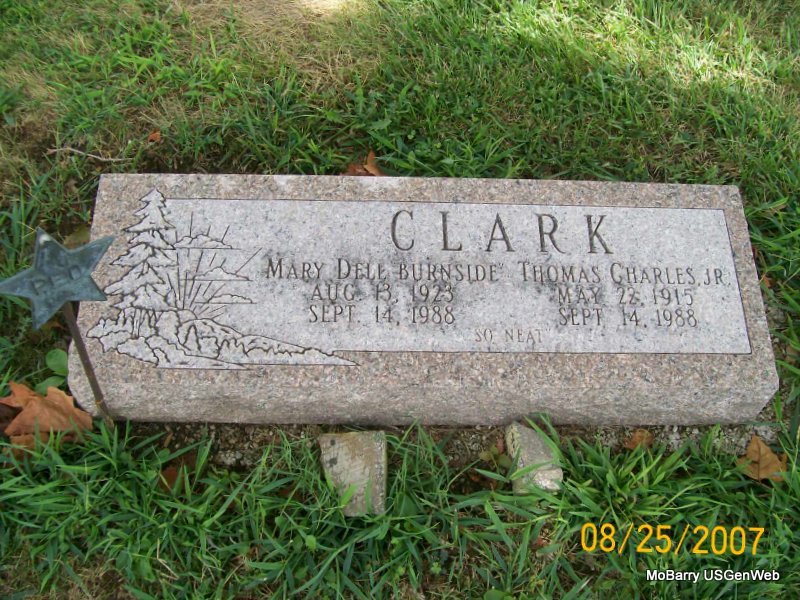 SSW: Mary Dell Burnside Clark - Research Note: Son of Thomas Charles Clark Sr. and Jessie Nelson Clark. He first Elsie Mae Hanson. Thomas Charles Clark, Jr., age 23, second married Suzanne Dazey, age 19, on June 23, 1938 in Clayton, St. Louis Co., MO. He third married Mary Dell Burnside. | Census MO Marriage Records Phyllis Long Photo Jay Trace |