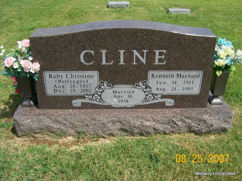 | CLINE, Ruby Christine (POTTENGER) | Aug. 28, 1917 | Dec. 29, 2002 | SSW: Kenneth Maynard - Inscription: "Married Apr. 16, 1938" - Research Note: Daughter of George William Pottenger and Sarah Elizabeth Ridens. Ruby Pottenger, age 20, married Kenneth Cline, age 27, on Apr. 16, 1938 in Aurora, Lawrence Co., MO. | MO Marriage Records Census Phyllis Long Photo Jay Trace |