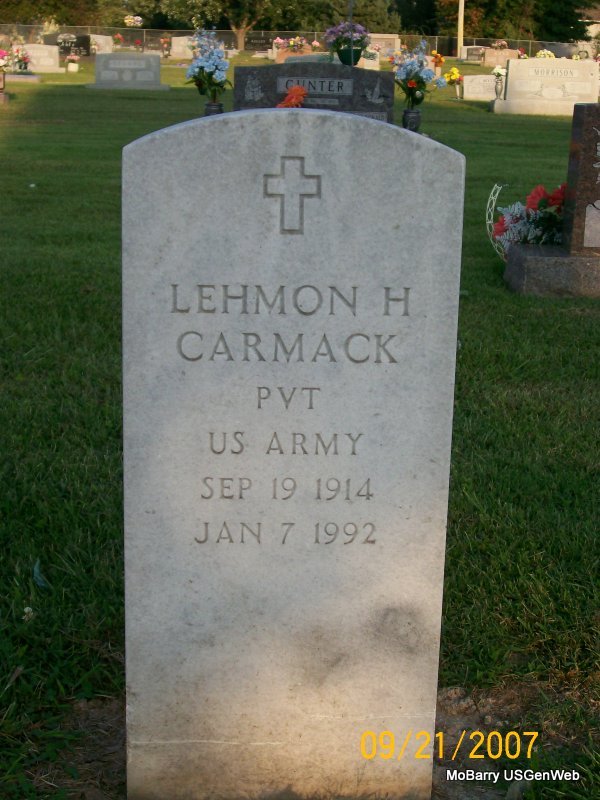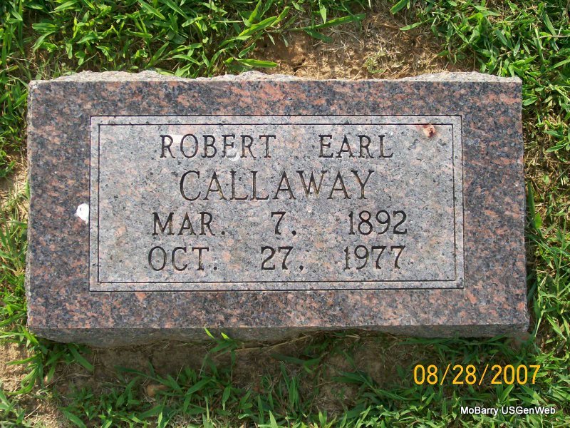 | CALLAWAY, Robert Earl | Mar. 7, 1892 | Oct. 27, 1977 | Research Note: Son of Robert Meigs Callaway and Minnie Jane Redwine. His wife was Laura Bernice Bragassa. - Jan 19, 1911, Thursday, Cassville Republican - Bob Callaway, the Monett furniture dealer and undertaker is said to be recovering from a surgical operation performed a few weeks ago. He has been in a critical condition for some time. - Callaway Plot Stone | Census Online Newspapers Phyllis Long Photo Jay Trace |