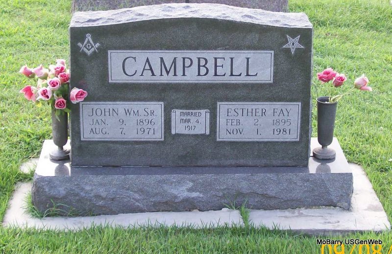SSW: Esther Fay - Inscription: "Married Mar. 4, 1917" - Research Note: Son of John William Campbell and Eva Lee German. He was a retired lawyer. His wife was the informant on the death certificate. | Census Death Certificate Phyllis Long Photo Jay Trace |