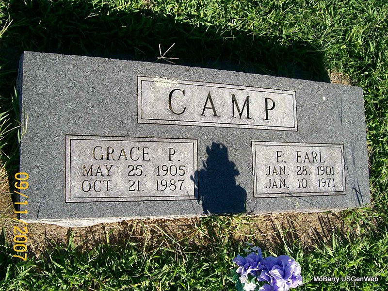 SSW: Grace P. - Research Note: Son of Joseph M. Camp and Myra Holliday. He was a retired school superintendent. Residence was Monett, Lawrence Co., MO. His wife was the informant on the death certificate. - E. Earl Camp, Retired School Official, Dies: E. Earl Camp, 69, died at 3:10 a.m. Sunday in St. Vincent's Hosp. following an illness of two months. Mr. Camp was born Jan. 28, 1901 in Pollock, MO and had lived in Monett since 1939, moving here from Mound City, MO. He had been superintendent of Monett Schools, retiring in 1965. Before coming to Monett he had been principal at the Mound City High School. He was a member of the Monett First United Methodist Church. He was past president of the Monett Kiwanis Club, MO Asso. of Jr. Colleges, MO State Administration Asso., and the MO State Principal's Asso. Mr. Camp held lifetime memberships in the MO State Teacher's Asso and the National Education Asso. He had been awarded the Beaver Award for his work with Boy Scouts. He married Grace Wright on Nov. 17, 1928. Additional survivors include a son, a sister and a granddaughter. | Buchanan Funeral Home Death Certificate Phyllis Long Photo Jay Trace |