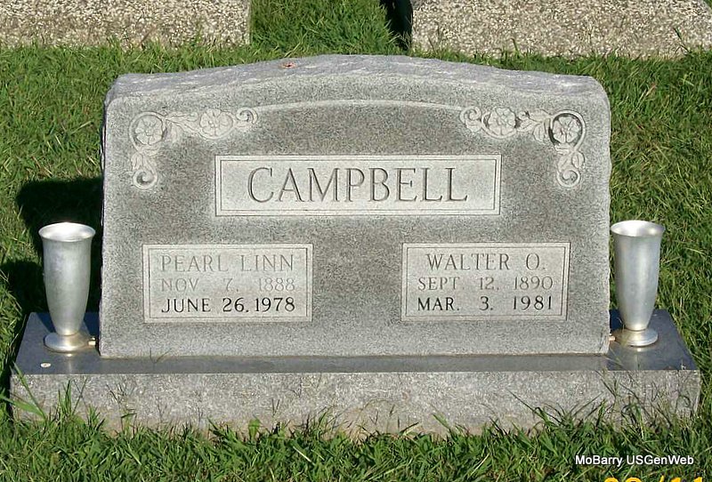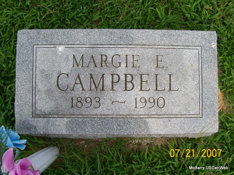 | CAMPBELL, Margie E. (TURNER) | 1893 | 1990 | Research Note: She is buried in the 1st Section, Block 27, Lot 2, Grave 4. W. W. Campbell is the Lot owner. Funeral Home given as Fitzgerald, Tulsa, OK. Margie E. Turner married T. Ronald Campbell on Oct. 14, 1915 in Mt. Vernon, Lawrence Co., MO. Daughter of Daniel W. and Mary A. Turner. | MO Marriage Records IOOF Log Book Phyllis Long Photo Jay Trace |
