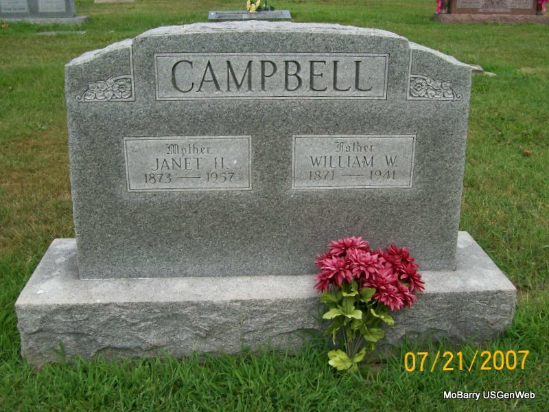 SSW: William W. - Inscription: "Mother" - Research Note: According to her death certificate she was age 83 years, 2 months and 12 days old at the time of her death. The cause of death was given as cerebral thrombosis; generalized arteriosclerosis. Her father was given as James Braidwood and her mother as Ellen Ralston. The informant was Mrs. Ella Campbell, Monett, MO - Death Certificate Number: 126 - Cassville Republican, Dec. 26, 1901 - Jno. W. Braidwood, brother of Mrs. W. W. Campbell of Monett, was killed in a runaway accident at Wentworth, Dec. 2. | Death Certificate Diana (Anderson) Cope Online Newspapers Phyllis Long Photo Jay Trace |