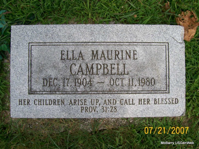 | CAMPBELL, Ella Maurine (DAVIS) | Dec. 17, 1904 | Oct. 11, 1980 | Research Note: Wife of James Ralston Campbell. Daughter of William Rufus Davis and Minnie Mae Hagler, both buried at IOOF. | Census Phyllis Long Photo Jay Trace |