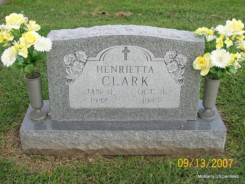 | CLARK, Henrietta Virginia (GARRISON) | Jan. 11, 1932 | Oct. 11, 1985 | Research Note: She is buried on the 3rd Section, Block 25, Lot 4, Grave 4. The lot owner was Marion and Henrietta Clark. The funeral home given as Holdern of Warrensburg, MO. Daughter of Burl G. Garrison and Zena M. O'Neal, married Marion Donald Clark. | IOOF Log Book Note Phyllis Long Photo Jay Trace |