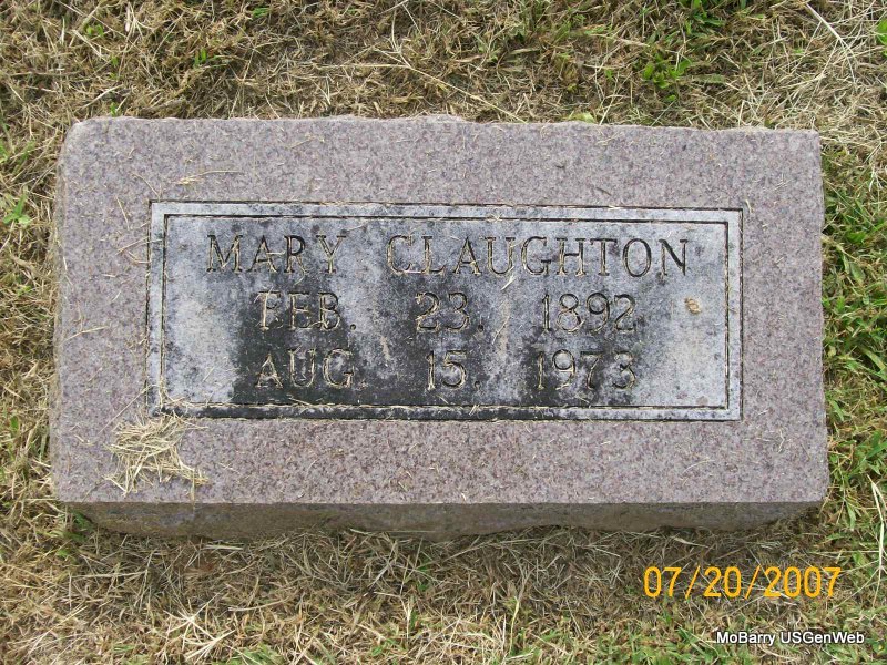 | CLAUGHTON, Mary | Feb. 23, 1892 | Aug. 15, 1973 | Research Note: Wife of Bob. | Census Phyllis Long Photo Jay Trace |