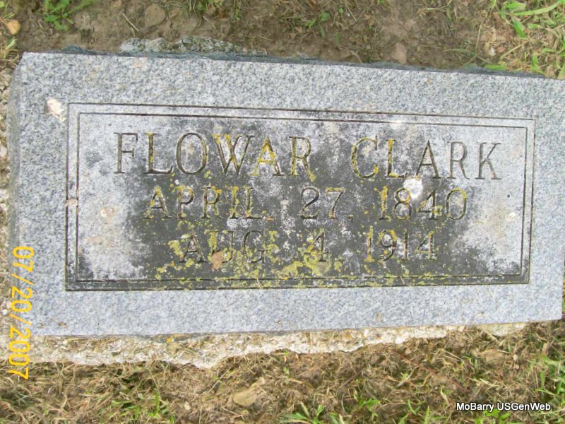 | CLARK, Flowar (LILLY)(DRAWBRIDGE) | Apr. 27, 1840 | Aug. 4, 1914 | Research Note: Callaway Funeral Home records state that Flower Clark was 76 years old and her birth and death dates match those on her stone. First husband was Alfred Drawbridge. Second married Mr. Clark. She died at the home of James Drowley, her son-in-law, and is buried next to him. The cause of death is listed as a factored hip. She was buried in IOOF on the 5th of August 1914. She was a daughter of William Lilly and Harriet Alchin, both born England. | Callaway Funeral Home Donna Cooper Census Phyllis Long Photo Jay Trace |