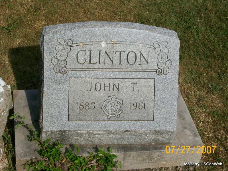 Research Note: Died at age 75. He was a conductor for the Frisco RR. His wife was Nell Clinton. Son of John E. Clinton and Mary Nelms. He first married Pearl May Miller. - ARTICLES WRITTEN UP IN THE MONETT TIMES, THURS. MARCH 4, 1971: Fifty Years Ago March 4, 1921 - Brakeman J. T. Clinton was injured near Carl Junction and was taken to the Frisco hospital at Springfield. | Death Certificate Online Newspapers Phyllis Long Monett Times Photo Jay Trace |