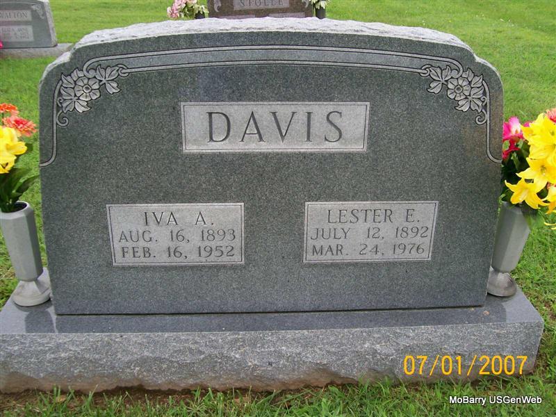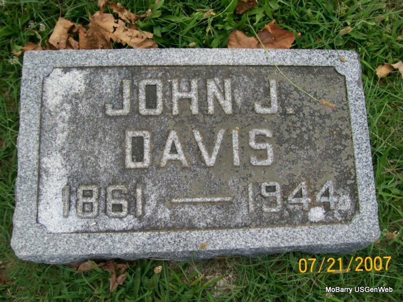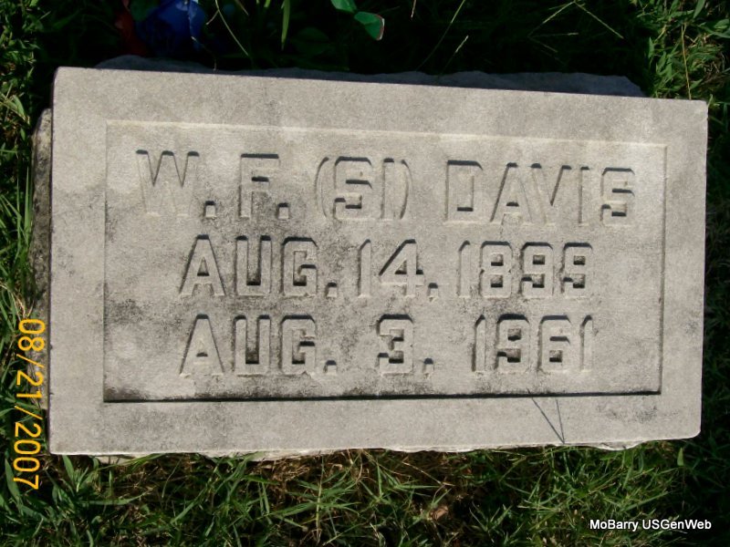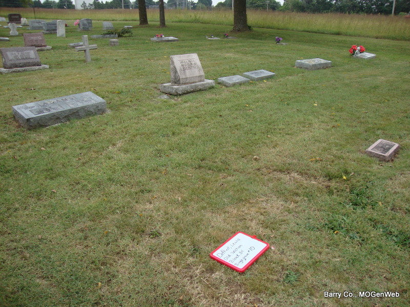 Research Note: The cemetery log book has that Dan E. Davidson was buried in the old section, in block 54, in a single lot in grave 43 on July 25, 1934. They have that he is without a stone. They have no other dates for him or who purchased the cemetery lot. His death certificate reads that he was married and that his wife was named Louisa M. Davidson. The cause of death was myocardial degeneration, old age, chronic diarrhea. His parents names were not listed. The informant was Mrs. Louisa M. Davidson, 314 Scott St., Monett, MO. He was buried in IOOF July 26, 1934. The cemetery log book has that Barry County was the purchaser of the lot. NO STONE | Death Certificate Donna Cooper IOOF Log Book Phyllis Long |