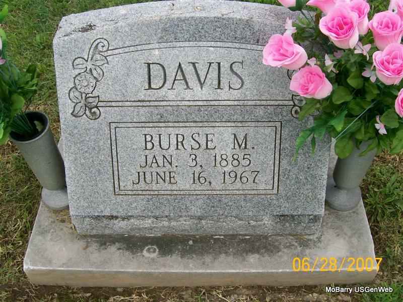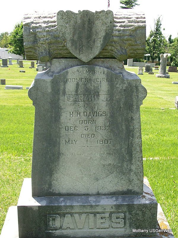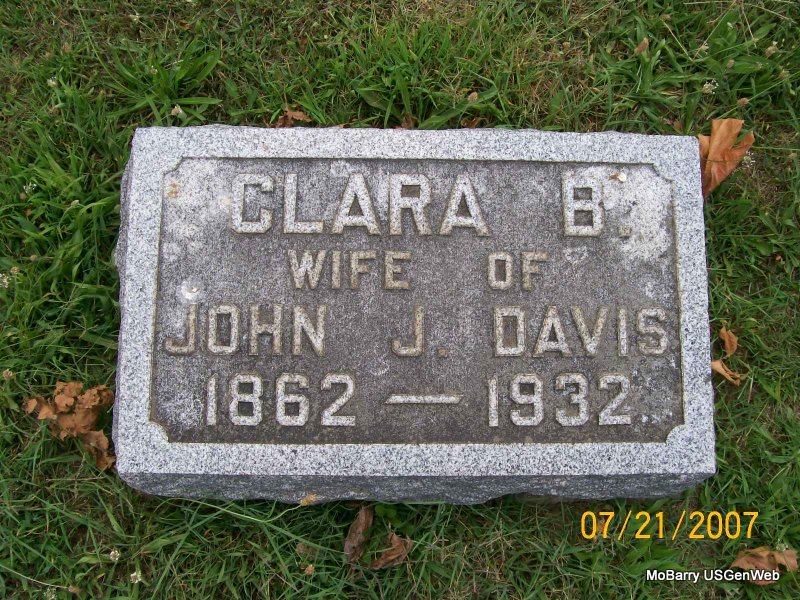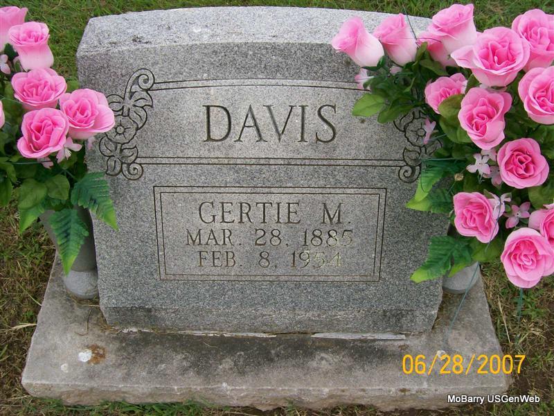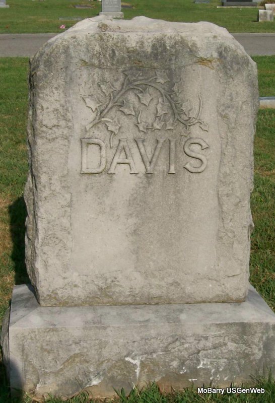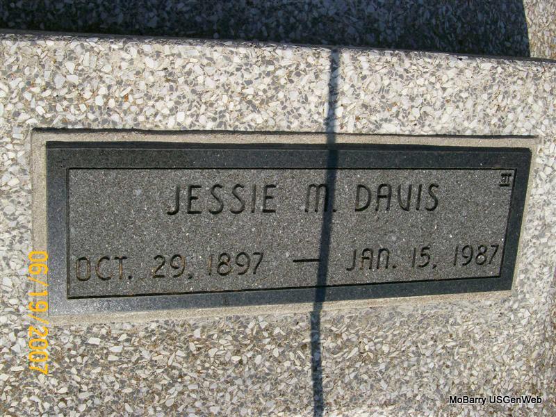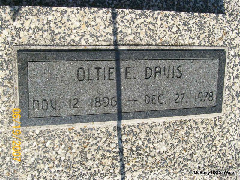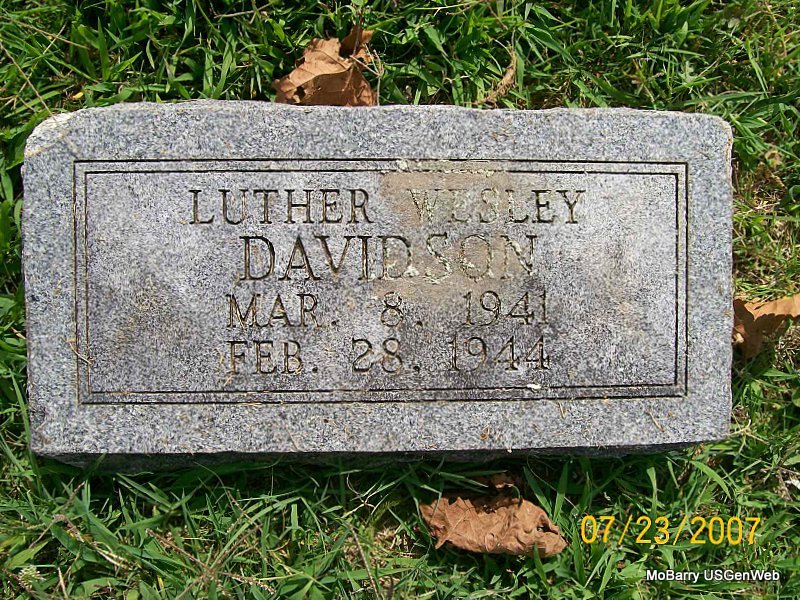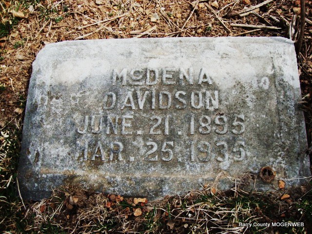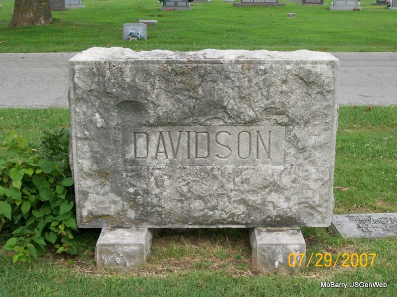 Research Note: According to the cemetery log book, there is a person named Louise Matilda Davidson buried in IOOF on Sept. 25, 1936 who is without a stone. They have no dates for her and nothing listed for the person who purchased the stone. They have her in the old section, in block 54, in a single lot in grave 21. According to her death certificate her husband was named Dan Davidson and she was widowed. She was age 86 and her father was given as Elisha Messick. Her mother's name was not listed. C. L. Hood, 326 __ Ave., Joplin, MO, was the informant. The date of the burial was reported as Sept. 24, 1936 in IOOF in Monett. NO STONE | Death Certificate Donna Cooper |