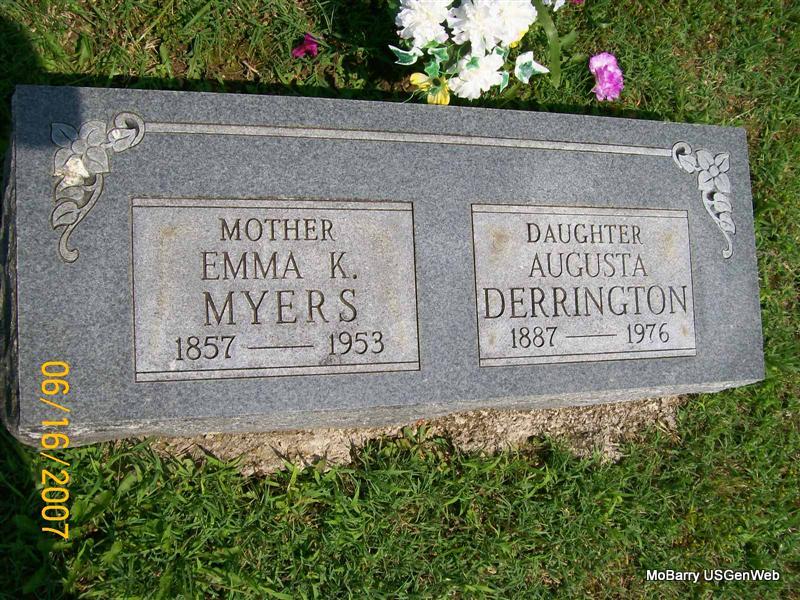 | DERRINGTON, Augusta (MYERS) (MATHEWS) | 1887 | 1976 | SSW: Emma K. Myers, Mother - Inscription: "Daughter" - Research Note: Daughter of Herman August and Emma K. Meyer/Myers, both buried in IOOF. - 1940 Census, Pierce City, Lawrence, Missouri - E. W. Mathews, head, age 60, born MO; Augusta, wife, age 50, born MO; Emma C., mother-in-law, age 82, widowed, born IL. | Census Phyllis Long Photo Jay Trace |
