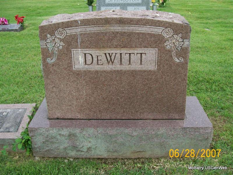 Research Note: The cemetery log book listed him as a veteran. He was a mail clerk for the U.S. Government. Son of John F. Dewitt and Della V. Foster. Dorothy Dewitt was his wife and she was the informant on the death certificate. WW I Veteran. - DeWitt Plot Stone | IOOF Log Book Death Certificate Phyllis Long Photos Jay Trace |
