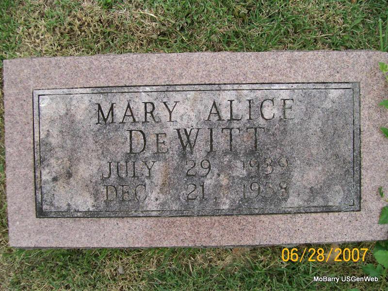 | DEWITT, Mary Alice | July 29, 1939 | Dec. 21, 1958 | Research Note: Daughter of Dwight Foster and Dorothy A. Dewitt. - DeWitt Plot Stone | Census Phyllis Long Photos Jay Trace |