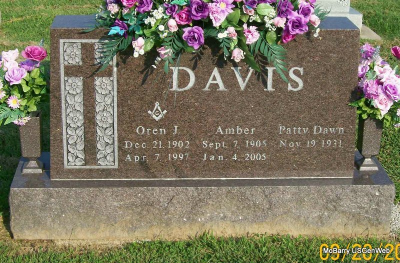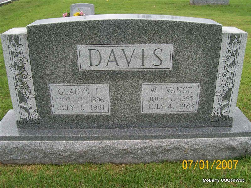 | DAVIS, William Vance | July 17, 1895 | July 4, 1983 | SSW: Gladys L. - Research Note: The cemetery log book has him as a veteran. - Son of Charles E. Davis and Carrie V. Vandirer. | IOOF Log Book Census Phyllis Long Photo Jay Trace |